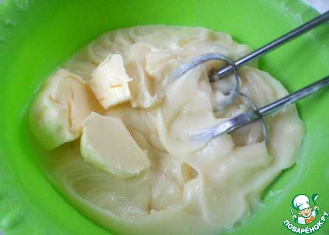 - Но мы еще покроем его масляным кремом. Для этого смешайте взбитое масло со сгущенкой.