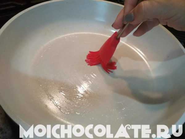 - Ставим сковороду на плиту, даём ей время хорошо разогреться, затем дно и бортики смазываем растительным маслом.