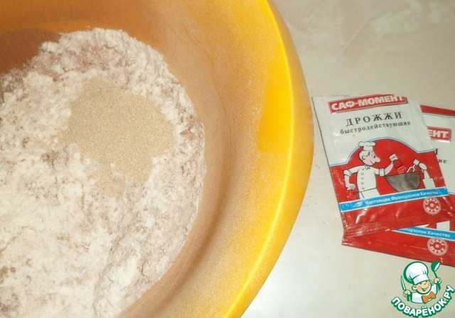 Просеять муку с какао-порошком в миску и добавить сухие быстродействующие дрожжи ТМ САФ -МОМЕНТ, перемешать тщательно венчиком.