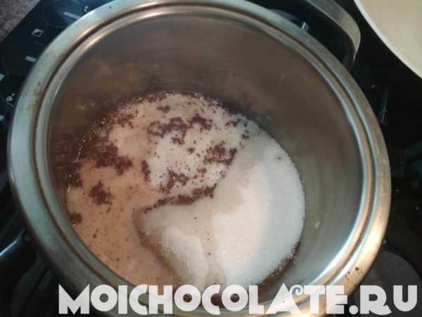 - Начинаем готовить вкусную шоколадную глазурь. Берем сотейник, смешиваем в нем сахар, какао, сметану и сливочное масло.