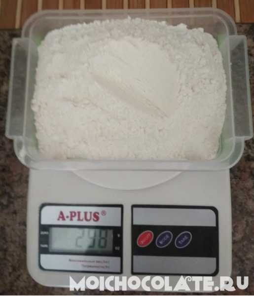 Для начала необходимо взвесить все ингредиенты. 300 гр. муки: