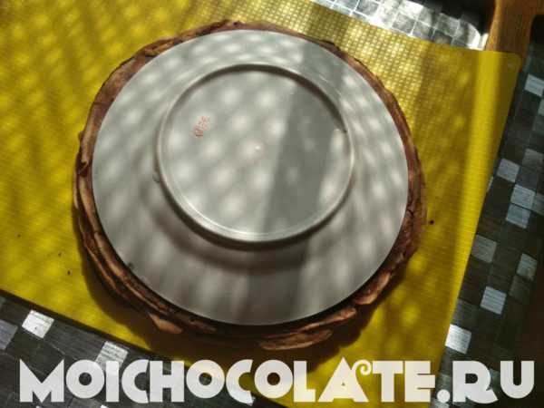 - Нужно взять стопку готовых блинчиков, тарелку и нож. Кладем тарелку на блины и вырезаем заготовки одинакового размера, чтобы шоколадный торт из блинчиков получился ровным.