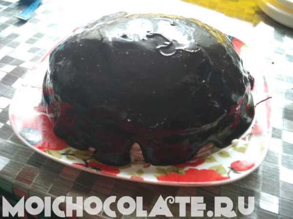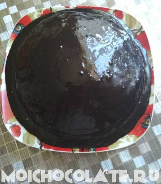 - Покрываем торт шоколадной глазурью. Убираем в холодное место на 2-3 часа для пропитки.