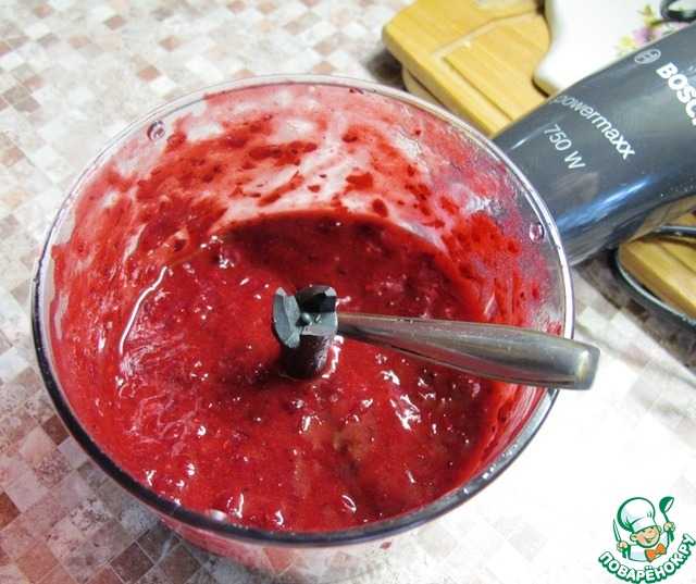 - Малину превратите блендером в пюре, перетрите через сито и добавьте в крем.