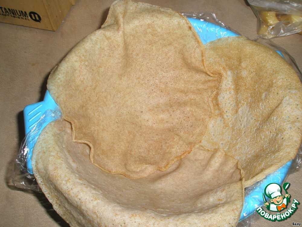 5. Далее наш кулинарный шедевр соберите в разъемной формочке. По бокам уложите цельные блинчики, причем так, чтобы они были внахлест и свисали. А красивая зажаристая сторона была с лицевой стороны.