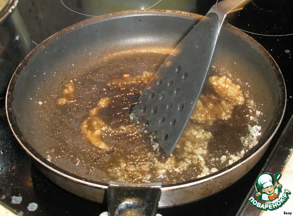 Растопите на сковородке сливочное масло, добавьте к нему сахар и прогревайте до образования карамели.