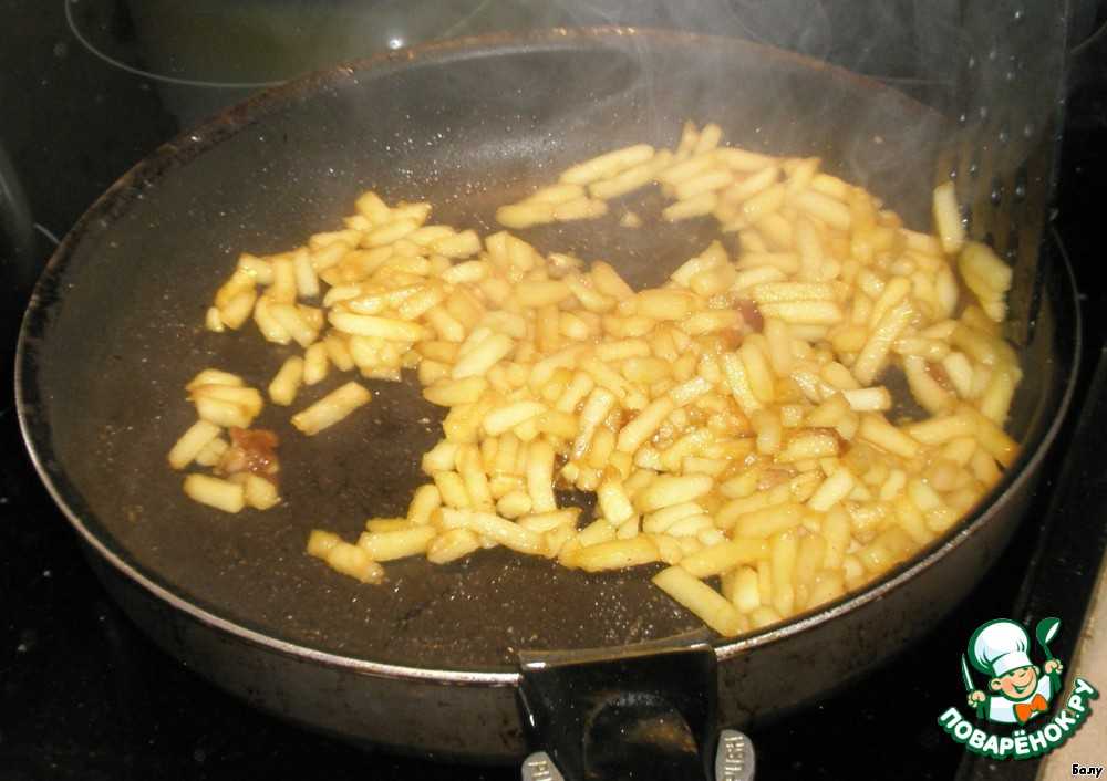 Затем добавьте нарезанные яблоки и обжарьте все вместе 3-4 минуты до полуготовности яблок. Нельзя допустить, чтобы яблоки разварились в кашу.