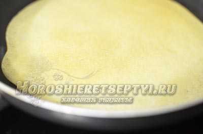 - Когда тесто растечётся, необходимо подождать 1-2 минуты, пока блинчик сверху подсохнет, перевернуть на другую сторону и дожарить со второй стороны.