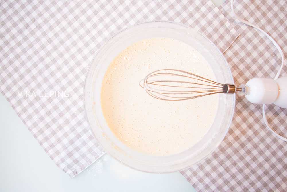 - Постепенно добавь муку. Продолжай взбивать до исчезновения комочков. Влей газированную воду, перемешай. Тесто не должно быть слишком густым или жидким.