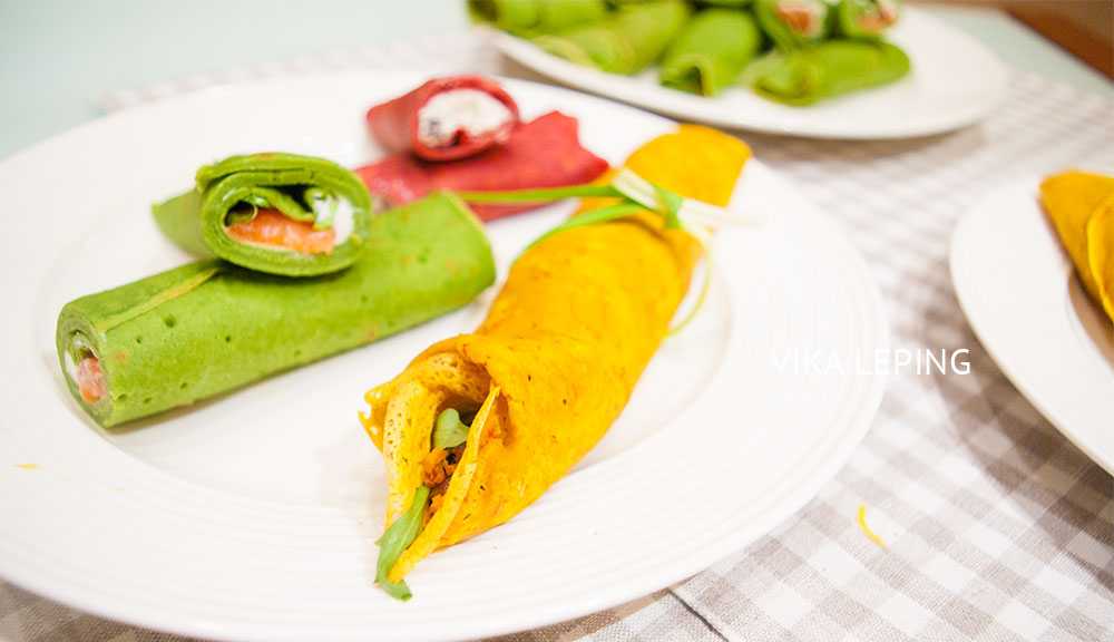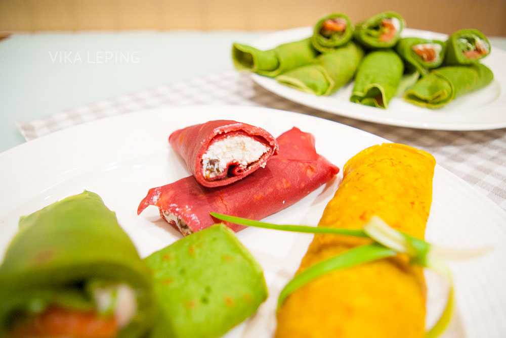 Рецепт приготовления цветных блинчиков с начинкой по шагам