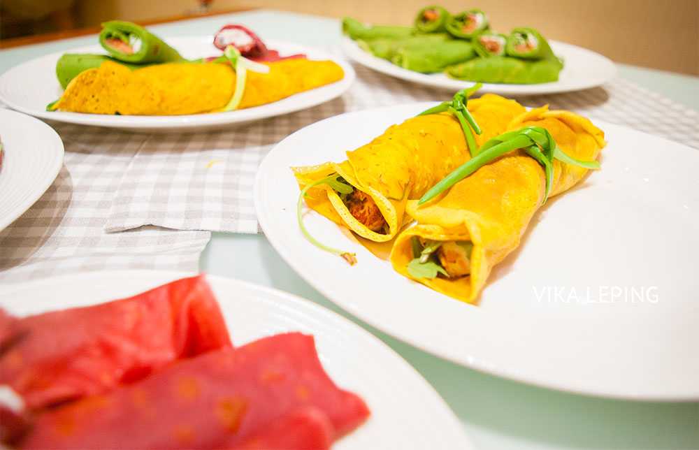 Для получения более эффектного блюда цветные блинчики можно начинять ингредиентами, которые будут контрастировать с основой. К примеру, оранжевые изделия хорошо фаршировать творогом и зеленью, красные – фаршем из темного мяса, а зеленые – различными ягодами или вареньем из них.