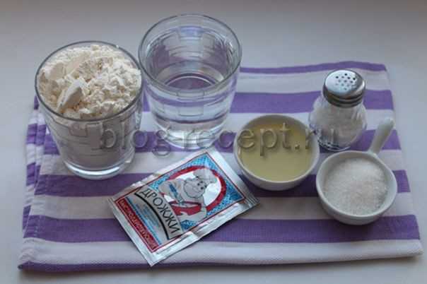 - берем минимум продуктов — пару стаканов муки, 40 мл воды, соль и сахар по вкусу, дрожжей 20 грамм;