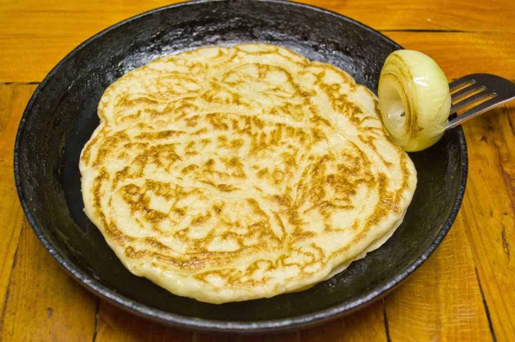 - Нагреть сковороду на огне, смазать дно растительным маслом и влить порцию теста. Обжарить его с обеих сторон по пару минут на умеренном огне.Если у вас сковорода с антипригарным покрытием, то смазать ее нужно только перед первой дозой теста, если же нет, то будете ее смазывать перед каждой порцией.