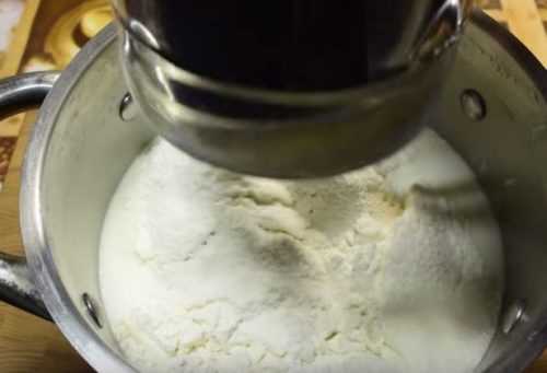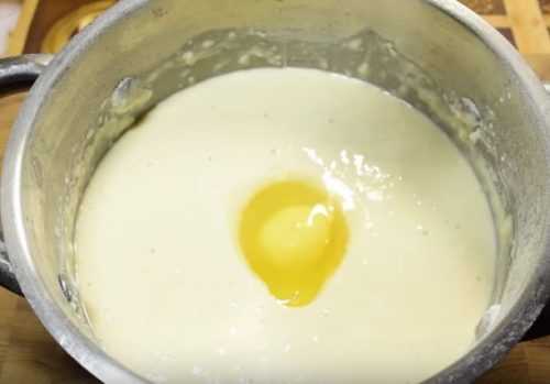 - В жидкость добавляем растительное масло, после чего всыпаем соль и муку. В последний момент добавляем подогретое молоко или воду и еще раз хорошо перемешиваем.