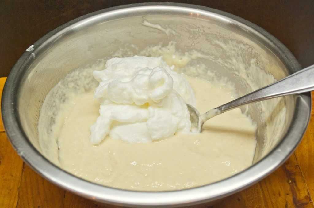 - Взбить до твердых пиков два белка и аккуратно вмешать их в тесто. Взбивать их можете с помощью блендера, переходя от минимальной скорости к максимальной.