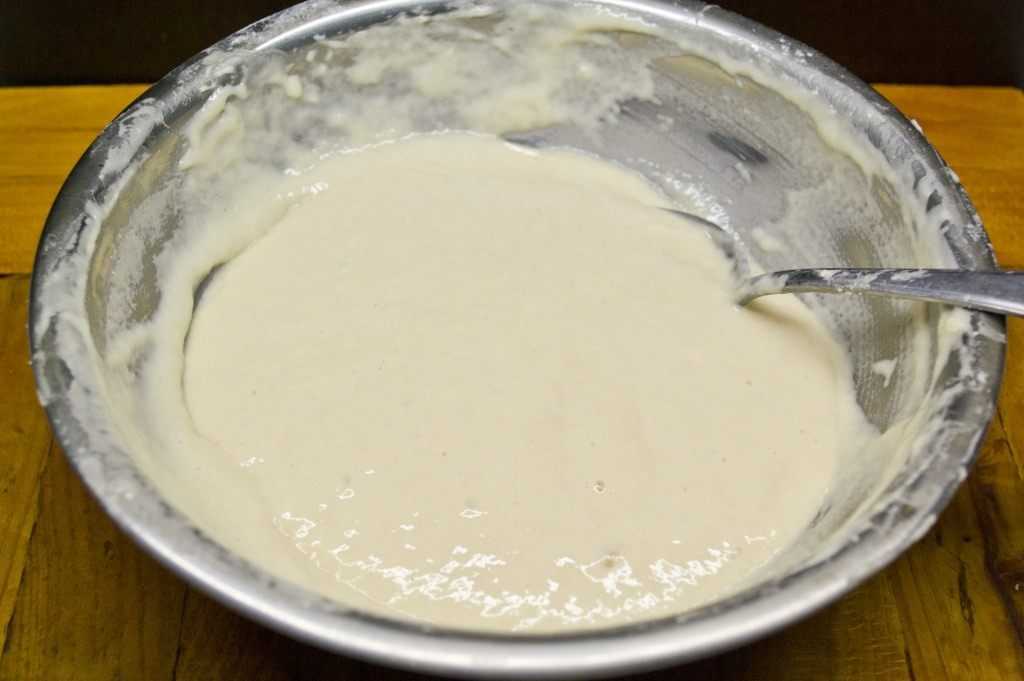 Тесто для дрожжевых блинов должно быть довольно жидким, как очень густые сливки или жидкая сметана. Вымешивать тесто нужно примерно 8-10 минут, тесто хоть и жидкое, но требует такого же внимания, как тесто для булочек, поэтому удобно поставить насадку «крюк» в миксере. Миску с тестом накрываем льняным полотенцем или затягиваем пищевой плёнкой, оставляем на 1 час при комнатной температуре.
