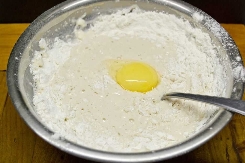- В подошедшую опару добавить 2 куриных желтка и перемешать. Белки пока можем оставить, мы вернемся к ним позже.
