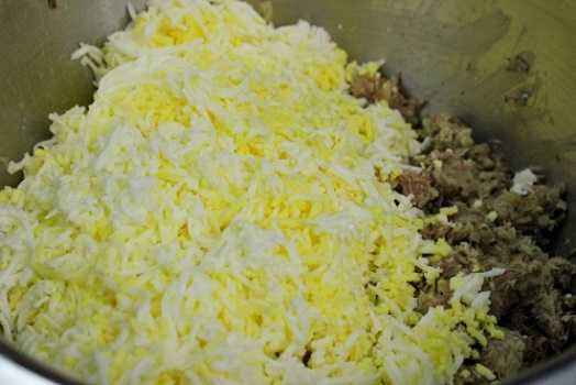 6. Вареные вкрутую яйца натрите на мелкой терке, соедините с мясом и луком. Посолите и поперчите, добавьте бульон. Все хорошо перемешайте.