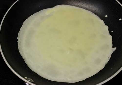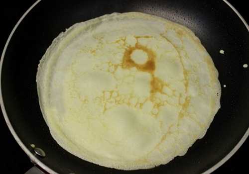 2. Сковороду расколите и смажьте кусочком сала. Налейте тесто и распределите тонким слоем по всей поверхности. Выпекайте с двух сторон до золотистого цвета.