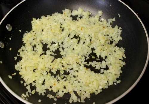 4. Лук мелко порежьте и обжарьте его на сливочном масле до золотистого цвета.
