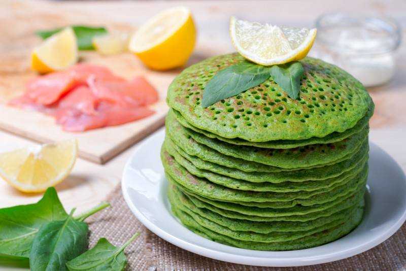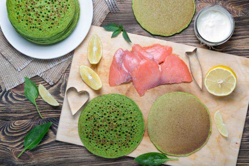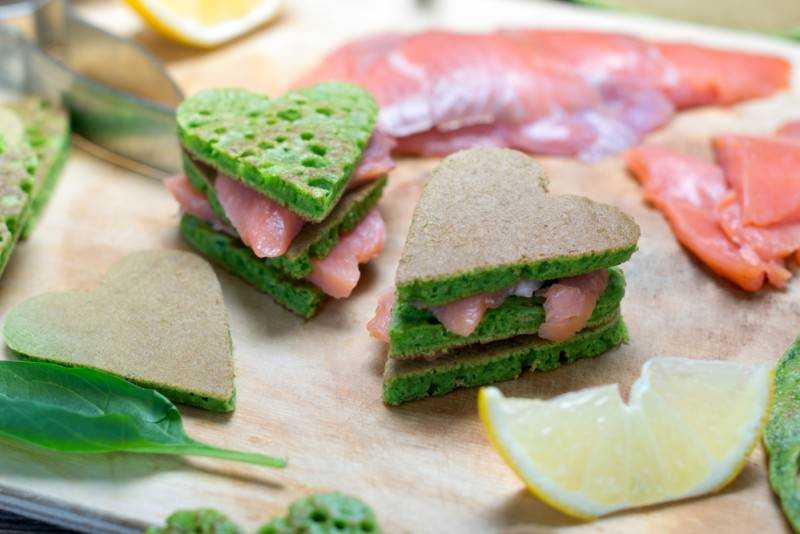 Такие яркие блины цвета весенней травы можно приготовить как из свежего, так и из мороженого шпината. Блинчики можно готовить на воде, молоке, кефире или простокваше. Нам также понадобится формочка для печенья в виде сердца, копченая семга или другая соленая красная рыба, творожный сыр.