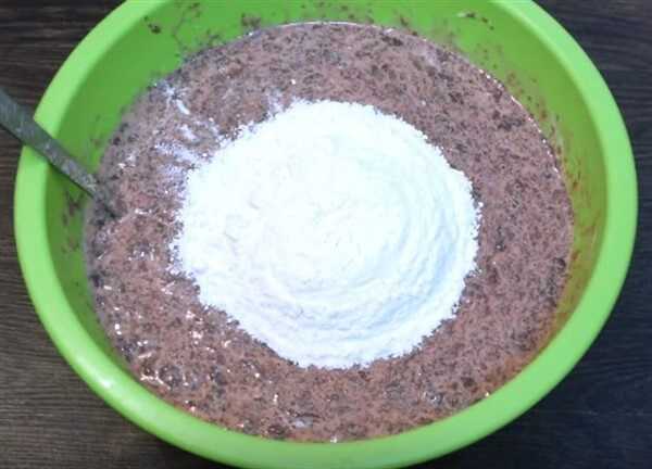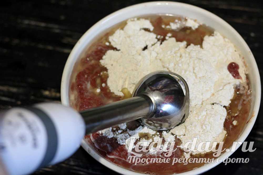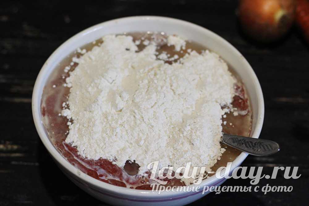 Затем высыпаем муку и снова смешиваем все ингредиенты для нашего мясного теста.