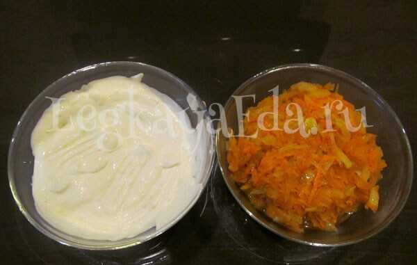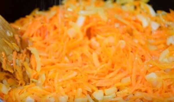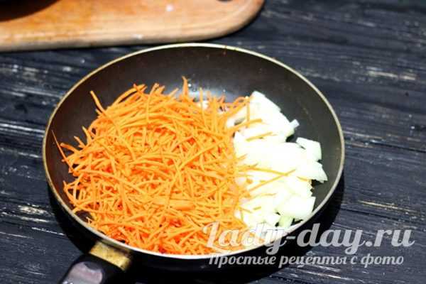 5. Лук и морковь чистим, лук мелко режем, морковь трем. И пассеруем на сковороде до готовности, не забыв посолить и поперчить. Все готово, можно приступать к сборке нашего закусочного пирога.