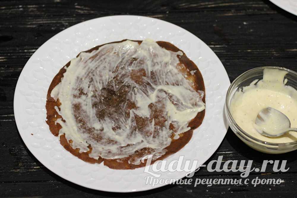 13. На тарелку выложите печеночный блинчик. Смажьте его майонезом или любым другим соусом на основе майонеза. Майонез для этого торта лучше использовать домашний.