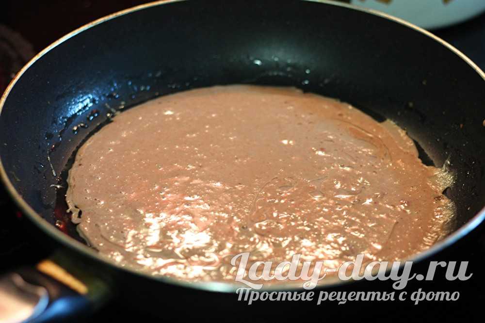 10. На раскаленную сухую сковороду вылейте небольшую порцию теста. Поджаривайте печеночный блинчик с двух сторон до образования зажаренной корочки.