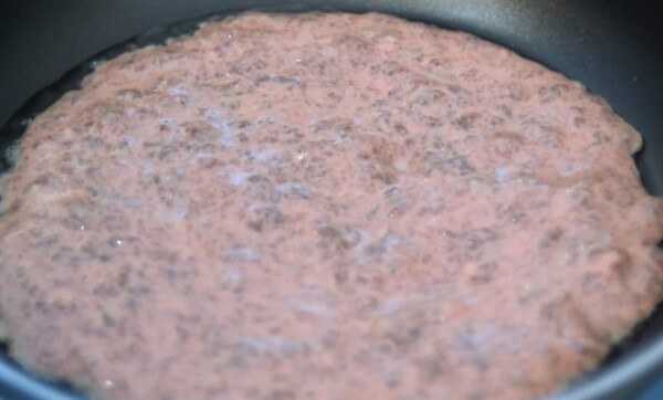 5. Через два часа достаем наш фарш. На разогретую сковороду наливаем растительное масло. Половником наливаем печеночную массу на сковороду, тыльной стороной ложки придавая ему ровные, круглые очертания.
