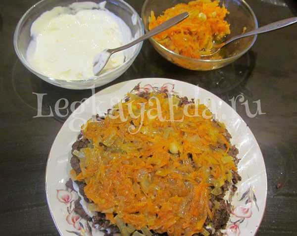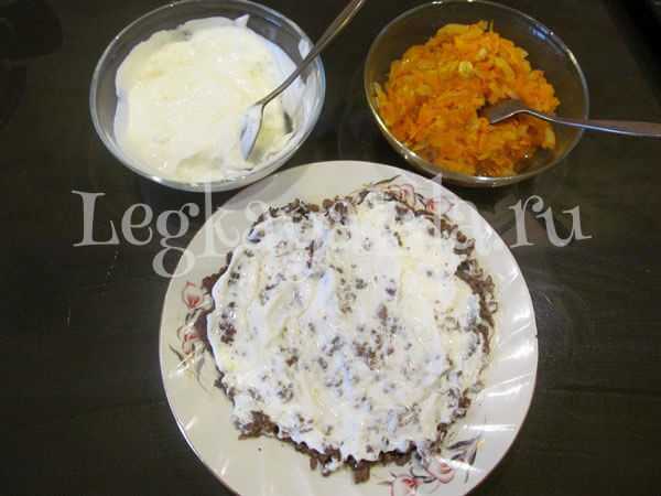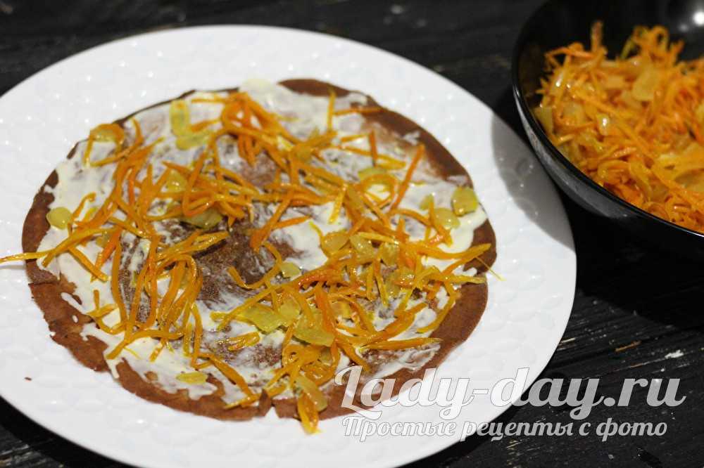 7. Каждый блин смазываем майонезом, а поверх выкладываем морковь с луком. Так собираем весь торт, завершающим слоем должен быть майонез. Даем ему настояться в холодильнике хотя бы 2-3 часа, а лучше всю ночь.