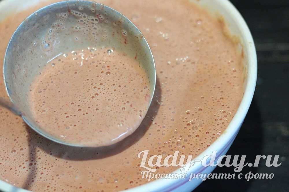 9. Тесто должно получиться довольно жидким, без комков. Дополнительно добавлять муку в него не следует. Работать с ним будет удобно с помощью небольшого половника.