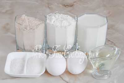 Использовать рекомендуется просеянную муку. Яйца, сахар, соль и 0,05 л. молока взбивают блендером. Потом добавляют муку и взбивают тесто вручную. Затем добавляют масло и 0,05 л. молока. Пекут тесто на сухой поверхности.