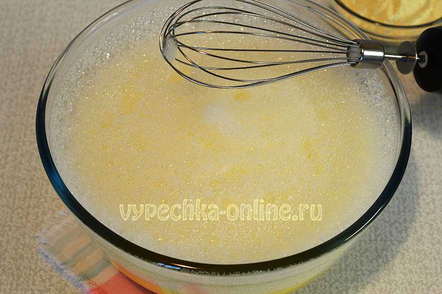 - Понемногу начните всыпать в тесто муку, мешая массу венчиком. Перемешайте все ингредиенты так, чтобы не осталось никаких комочков.