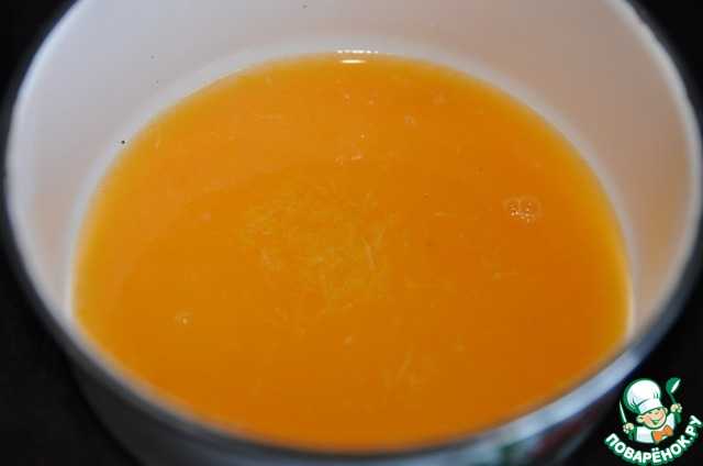 Добавляем желток с миндальной мукой к мандариновому соку, перемешиваем до заваривания. Добавляем заваренную молочную смесь, соль, ещё раз всё перемешиваем до однородности.