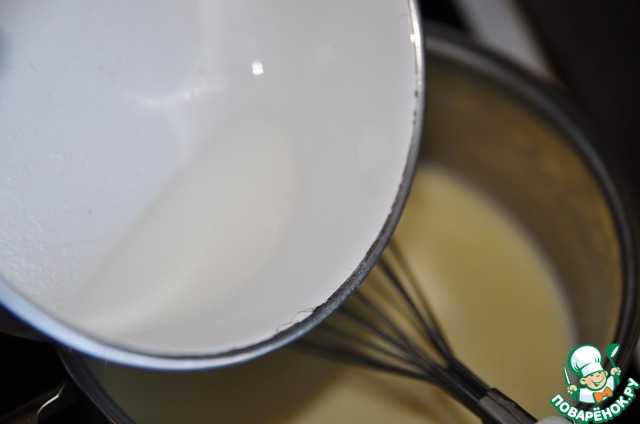 Ставим смесь на средний огонь, помешиваем. Вводим крахмал, растворённый в 20 мл молока.