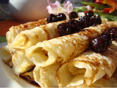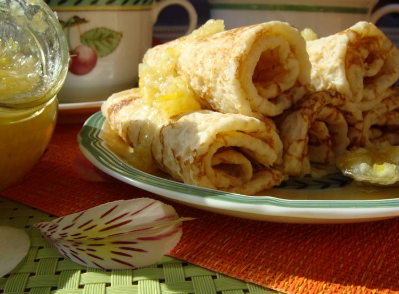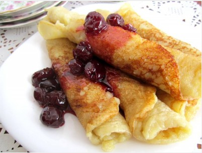 Подают блинчики с джемом, повидлом, сметаной, медом.