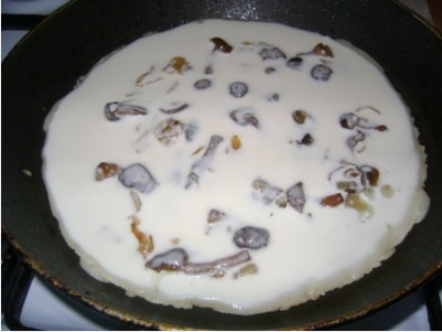 - Смазываем сковородку растительным маслом или жиром, ставим на средний огонь и нагреваем. На разогретую сковородку наливаем тесто и распределяем равномерно по всей площади.