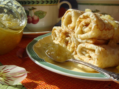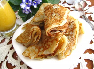 Готовые блинчики подают на стол с джемом, вареньем, сметаной либо сгущенным молоком или медом. При этом запивают свежезаваренным чаем с травами или молоком.