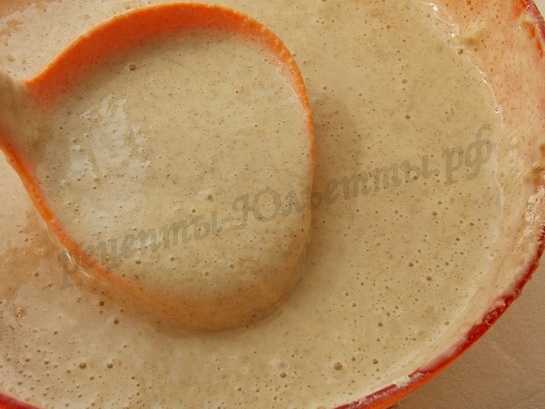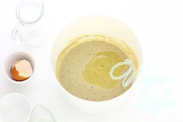 - Когда тесто немного отдохнуло, вливаем теплое растительное масло и добавляем соду. Взбиваем до однородной консистенции, избавляемся от комочков. При необходимости регулируем густоту, добавляя воду.