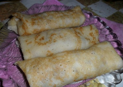 Можно положить творог, пережаренный мясной или куриный фарш, а также икру и свернуть блинчики трубочками или конвертами. В таком случае будет уместно их подать с острым или пикантным соусом.