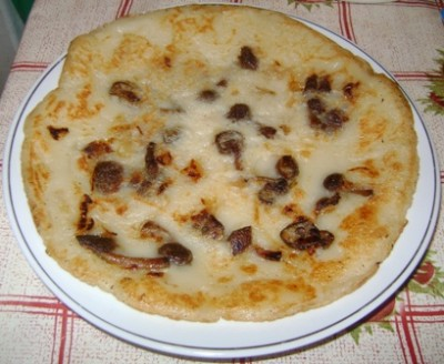 - Сковороду раскалить на большом огне, смазать ломтиком свиного сала, в центр выложить небольшой объем теста и позволить ему равномерно растечься по поверхности.