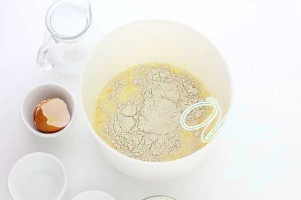 - Вливаем полученную массу в углубление, сделанное в муке. Перемешиваем.