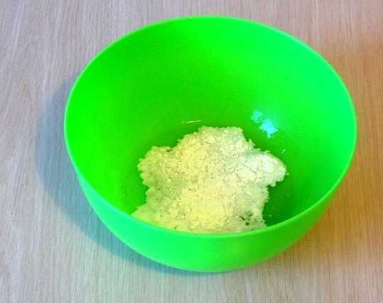 - Добавить в смесь муку и размешать без образования комочков. Вымесить тесто руками, смазанными маслом. Нужно сделать его упругим, но не плотным. При необходимости – добавить воды.