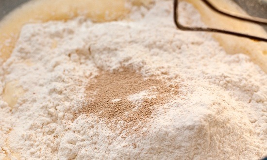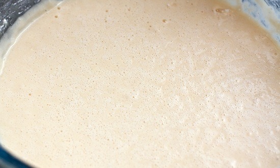 Сначала влить половину тёплого молока, всыпать просеянную муку и дрожжи. Потом добавить вторую часть молока, взбить до равномерного распределения всех ингредиентов