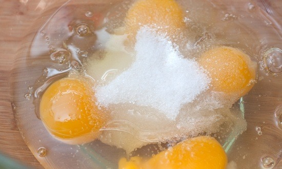 В отдельную чашу разбить яйца, добавить к ним соль, сахар. Всё немного взбить
