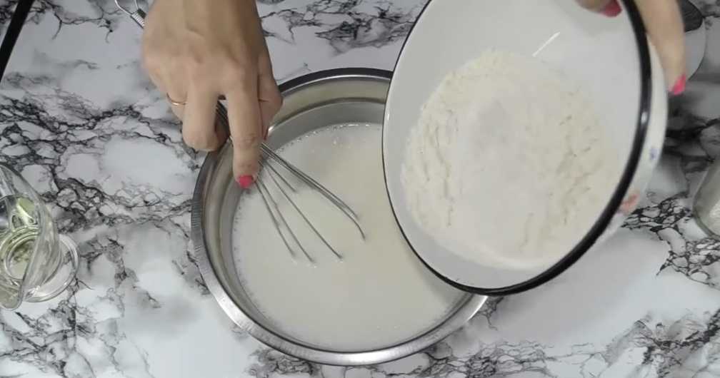 Теперь есть два варианта. В первом мы выливаем жидкие компоненты в муку и замешиваем однородное тесто. Во втором мы муку всыпаем в жидкую часть теста и также постепенно перемешиваем массу, добиваясь получения гладкого теста. Консистенция его должна походить на густой кефир.