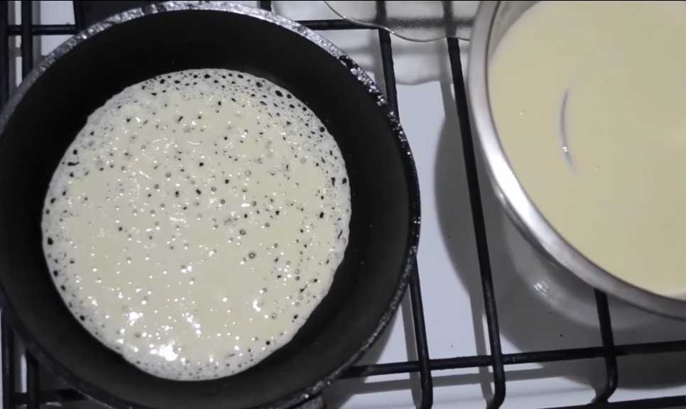 Поварежкой наливаем немного теста, распределяем его по всей поверхности сковороды и жарим с двух сторон.