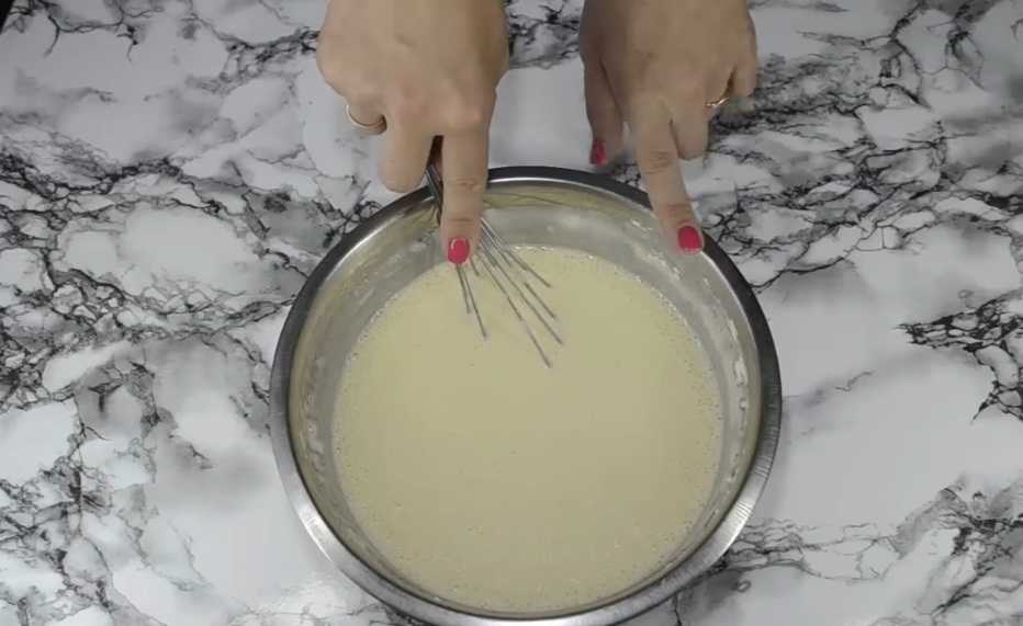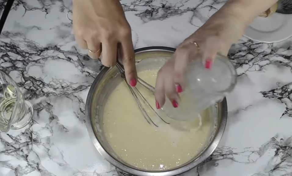 - Продолжая взбивать, добавьте в кефир желтки и немного воды. Размешайте до однородного состояния.