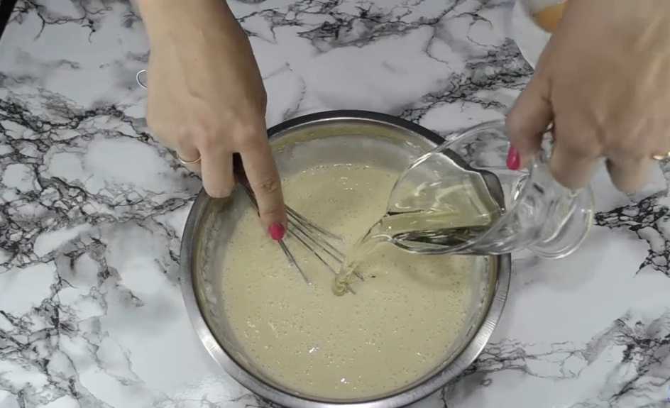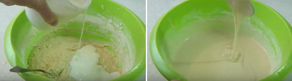 - Добавьте в тесто растительное масло и, при необходимости, еще воды. Консистенция теста должна быть, как у жидкой нежирной сметаны.